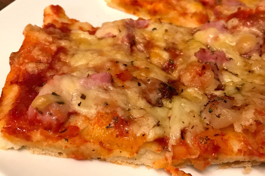 Mix all dry ingredients. Add milk and oil. Mix until soft dough. Press the dough on a large oven tray or divide on two smaller. Spread the tomato sauce on the base and add your ingredients.